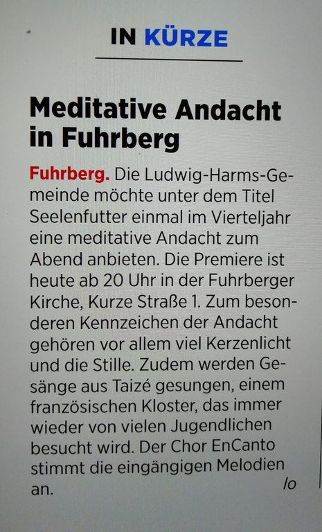 Dienstags zur Probe vorbei. Wir proben von 19:30 - 21:00 Uhr im Fuhrberger Gemeindehaus.